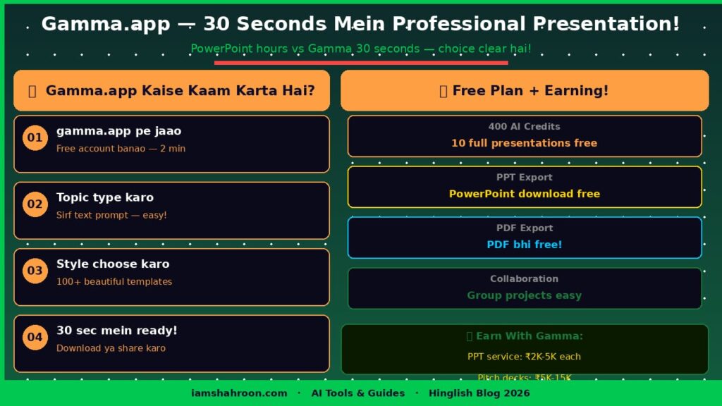 gamma.app pe jaao — free account banao — ‘Create new’ click karo — apna topic type karo — 30 seconds mein poori presentation ready! 400 free AI credits milte hain — 10 complete presentations free. PowerPoint export bhi free hai.